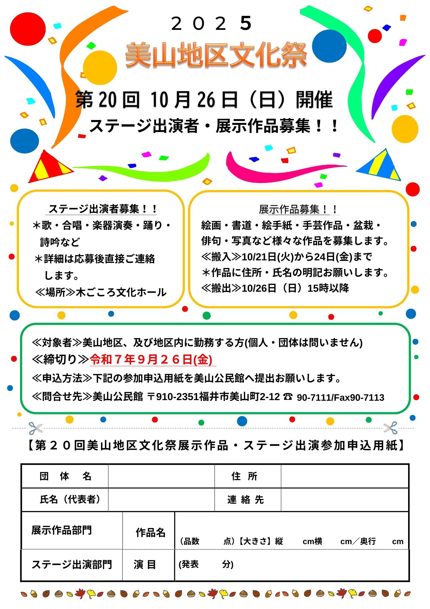 お知らせ 【美山地区文化祭】10月26日(日)ステージ出演・展示作品募集!! 投稿: 2025年9月19日 10/27(日)美山地区文化祭が開催されます。ステージ出演者、展示作品を大募集します!! コメントなし 【健康長寿事業】9月28日(日)押し花で手仕事ワークショップのお知らせです! 投稿: 2025年8月8日 コメントなし 【環境教育事業】8月3日(日)夏野菜保存食講座のお知らせです! 投稿: 2025年7月17日 コメントなし 【美山公民館】7月27日(日)美山ふれあいまつりのお知らせです!! 投稿: 2025年6月13日 コメントなし 【伝統文化伝承事業】7月19日(土)夏野菜料理教室のお知らせです! 投稿: 2025年6月13日 コメントなし 【環境教育事業】7月6日(日)アユ釣り体験のお知らせです! 投稿: 2025年6月13日 コメントなし 【福井学事業】6月29日(日)下宇坂分館事業、市波の農業用水をめぐる健康ウォークのお知らせです! 投稿: 2025年6月13日 コメントなし 【環境教育事業】6月1日(日)昔遊びを楽しもう!のお知らせです! 投稿: 2025年5月16日 コメントなし 【健康長寿事業】6月28日(土)多肉植物寄せ植え教室のお知らせです! 投稿: 2025年5月16日 コメントなし 【市民ICT事業】6月21日(土)Chat GPT(チャット ジーピーティー)入門講座のお知らせです。 投稿: 2025年5月16日 コメントなし 休館日・イベントカレンダー 2025年 10月月火水木金土日29301234567891011121314151617181920212223242526美山地区文化祭そばまつりinみやま272829303112 休館日 Posted by miyama