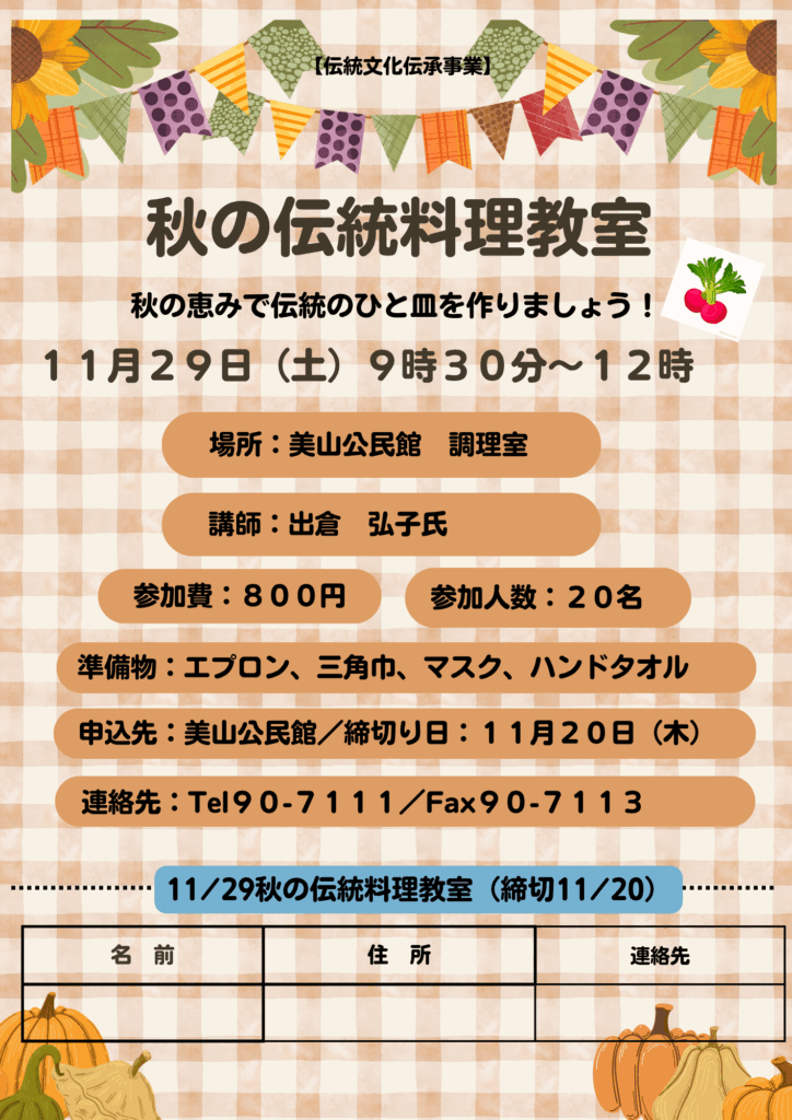 【伝統文化伝承事業】11月29日(土) 秋の伝統料理教室のお知らせです!!