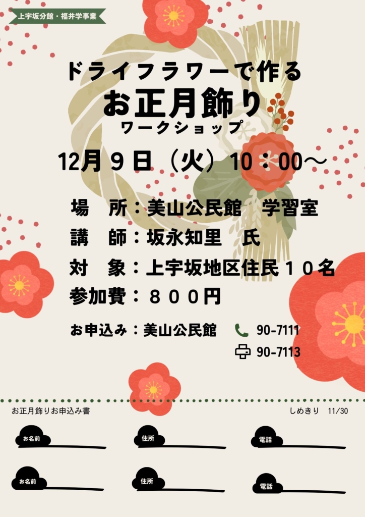 【福井学講座】12月9日(火) 上宇坂分館 ドライフラワーで作るお正月飾りワークショップのお知らせです!! 12月9日(火)、上宇坂分館、上宇坂地区住民を対象としたお正月飾りつくり講座です お知らせ教育事業,美山公民館,美山地区Posted by miyama